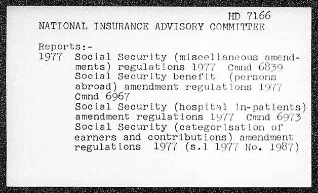 HD 7166 NATTONAL INSURANCE ADVISORY COMMTTTER Reports: - 1977 Social Security (miscellaneous amend- ments) regulations 1977 cCmnd 6839 Social Security benefit (persons abroad) amendment regulations 19'/% Cmnd 6967 Social Security (hospital in-patients) § amendment regulations 1077 Cmnd 6974 § Social Security (categorisation of earners and contributions) amendment regulations 1977 (s.1 1977 No. 1987)