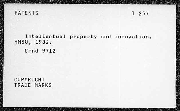 PATENTS Intellectual property and innevation. HMSO, 1986. Cmnd 9712 COPYRIGHT TRADE MARKS