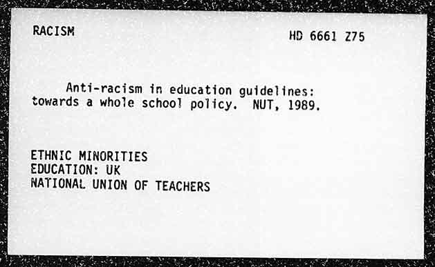 RACISM HS 6661 Anti-racism in education guidelines: towards a whole school policy. NUT, 1989, ETHNIC MINORITIES EDUCATION: UK NATIONAL UNION OF TEACHERS