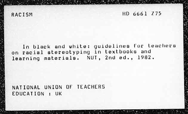 RACISM HD 6661 275 In black and white: guidelines for teachers on racial stereotyping in textbooks and learning materials. NUT, 2nd ed., 1982. NATIONAL UNION OF TEACHERS EDUCATIGN : UK