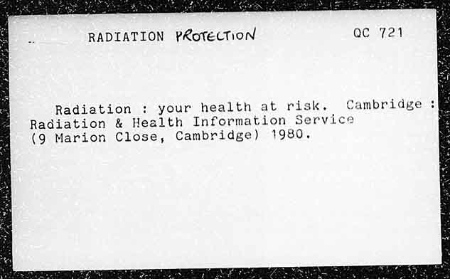 Radiation : your health at risk. Cambridge Radiation & Health Information Service (9 Marion Close, Cambridge) 1980.