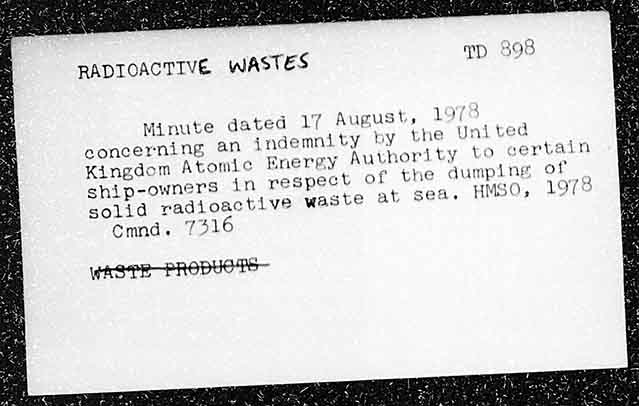 RADIOACTIVE WASTES Minute dated 17 August, 197° concerning 4n indemnity by the United Kingdom Atomie HKnerey Authority to certain ship-owners in respect of the dumping of solid ra adioactive waste at sea. HMSO, 1978 Cmnd. 7316 WASTE PRODUCTS