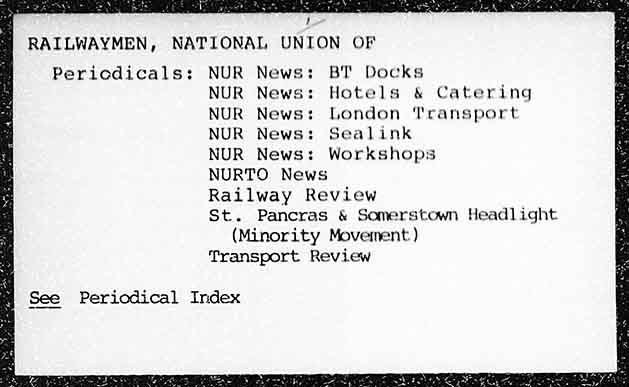 RAILWAYMEN, NATIONAL UNION OF Pericdicals: NUR News: BT Docks NUR News: Hotels & Catering NUR News: London Transport NUR News: Sealink NUR News: Workshops NURTO News Railway Review St. Pancras & Somerstown Headlight (Minority Movement) Transport Review See Periodical Index