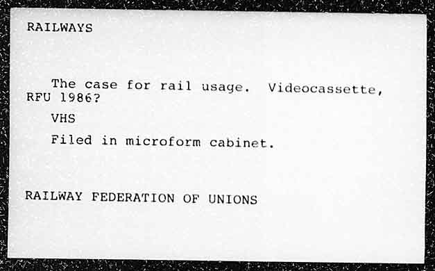 RAILWAYS The case for rail usage. Videocassette, RFU 1986? VHS Filed in microform cabinet. RAILWAY FEDERATION OF UNIONS