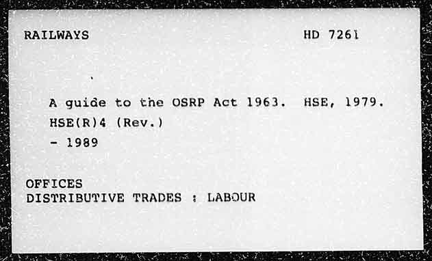RATLWAYS A guide to the OSRP Act 1963. HSE(R)4 (Rev. ) = 989 OFFICES DISTRIBUTIVE TRADES : LABOUR HD 7261 HSE, 1979.