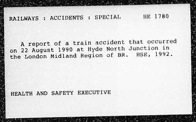 RAILWAYS : ACCIDENTS : SPECIAL, HE 1780 A report of a train accident that eccurred on 22 August 1990 at Hyde North Junction in the London Midland Region of BR. HSE, 1992,