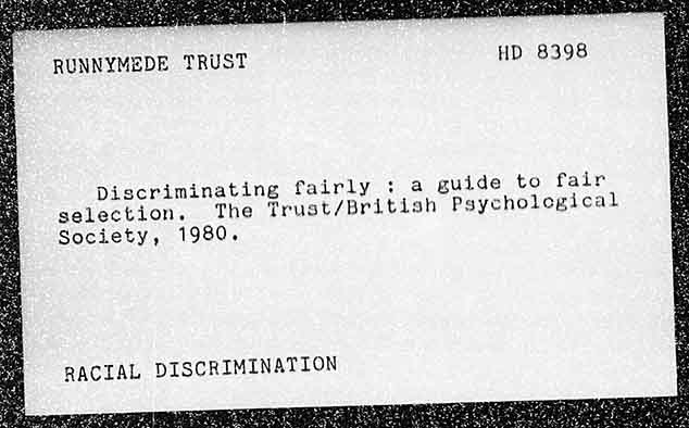 RUNNYMEDE TRUST HD 8398 Discriminating fairly : a guide to fair Psycholegical selection. The Trust/British Society, 1980. RACIAL DISCRIMINATION