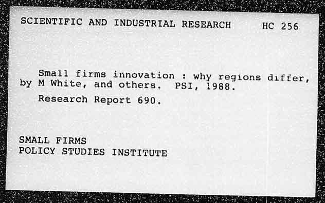 SCIENTIFIC AND INDUSTRIAL RESEARCH HC 256 Small firms innovation ; why regions differ, by M White, and others. PST, 1988. Research Report 690. SMALL FIRMS POLICY STUDIES INSTITUTE