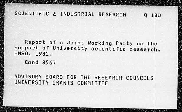Report of a Joint Working Party on the support of University scientific research. HMSO, 1982. Cmnd 8567 ADVISORY BOARD FOR THE RESEARCH COUNCILS UNIVERSITY GRANTS COMMITTEE