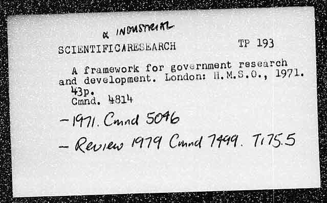 I uoare atic flaps Palace [lobia A ta Ev Wea Ce eR RN rd ell SUR a In rasries ft SCIWMNTIFL OARUGEARCH TP 193 A framework for government research — and development. London: H.M.S.0-, 1971. Rabe e — 1497, Curnd 50t6 a Rev eu) 1474 Cand 71449. Tt 75.5