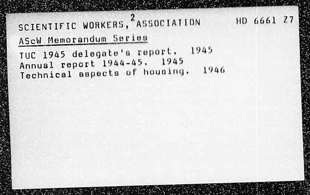 2 SCIENTIFIC WORKERS, ASSOCTATEON AScW Memorandum Series TUC 1945 delegate's report, 1945 Annual report 1944-45. 1945 Technical aspects af housing. 1946