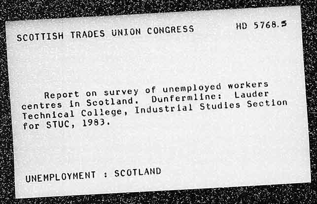 GRESS SCOTTISH TRADES UNION CON of unemployed workers Dunfermline: Lauder Report on survey tudies Section centres in Scotland. Technical College, Industrial 5 for STUC, 1983: UNEMPLOYMENT s SCGTLANE