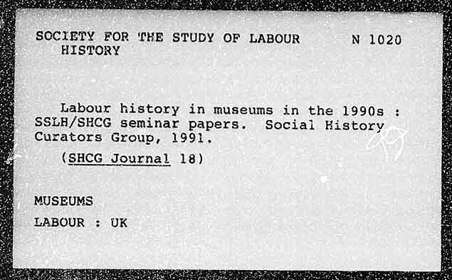 SOCIETY FOR THE STUDY OF LABOUR N 1026 HISTORY Labour history in museums in the 1990s : SSLH/SHCG seminar papers. Social History Curators Group, 1991, (SHCG Journal 18) MUSEUMS LABOUR : UK