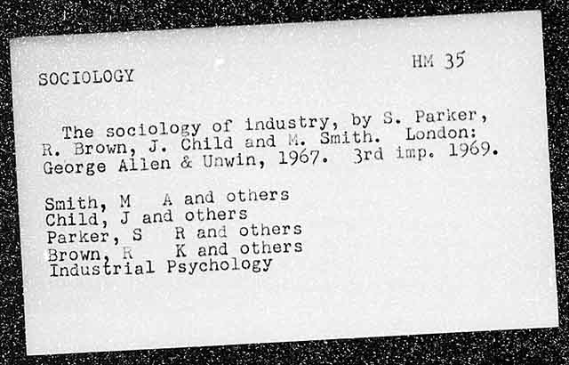 SOCIOLOGY HM 35 The sociology of industry, by 5- Parier ,y R. Brown, J. Child and M. Smith, London: George Allien & Unwin, 1967. 3rd imp. 1969-6 Smith, MA and others Child, J and others Parker, 5 R and others Brown, i K and others Industrial Psychology