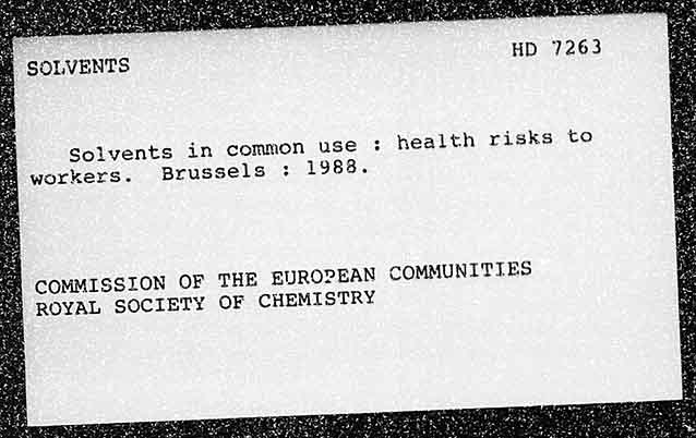 SOLVENTS HD 7263 Solvents in common use : health risks to workers. Brussels : 1988. TON OF THE EUROPEAN COMMUNITIES ROYAL SOCIETY OF CHEMISTRY COMMISS