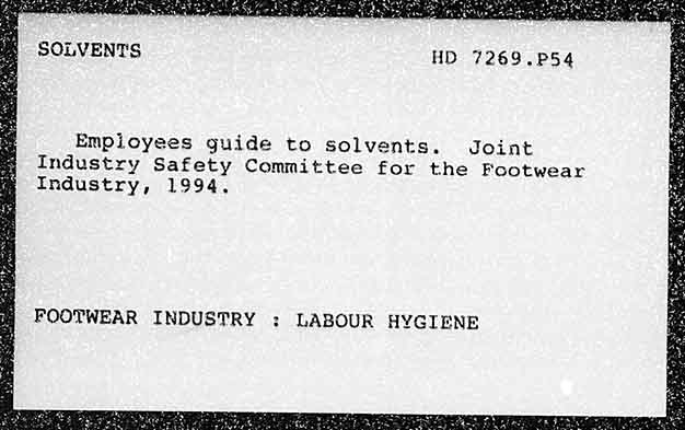 SOLVENTS HD 7269.P54 Employees guide to solvents. Joint Industry Safety Committee for the Footwear Industry, 1994. FOOTWEAR INDUSTRY : LABOUR HYGIENE