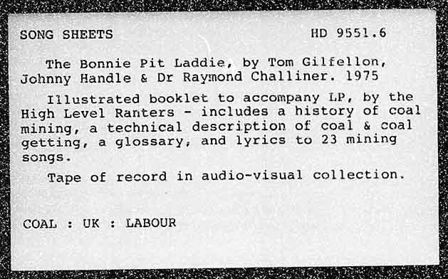 SONG SHEETS HD 9551.6 The Bonnie Pit Laddie, by Tom Gilfellon, Johnny Handle & Dr Raymond Challiner. 1975 Tilustrated booklet to accompany LP, by the High Level Ranters - includes a history of coal mining, a technical description of coal & coal getting, a glossary, and lyrics to 23 mining songs. Tape of record in audio~visual collection. UK : LABOUR