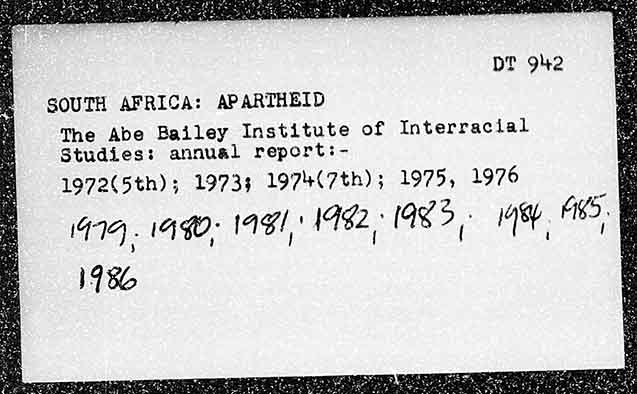 DT 942 SOUTH AFRICA: APARTHEID The Abe Bailey Institute of Interracial Studies: annual report:- 1972(5th); 19733 1974(7th); 1975, 1976 19914 . 1490 148!" 1982 ° (9X 20 ay 85. : 19 Bo me