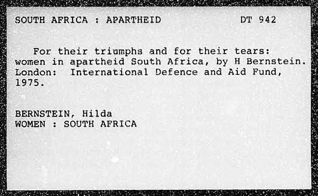 SOUTH AFRICA : APARTHEID DT G42 For their triumphs and for their tears: Bs women in apartheid South Africa, by H Bernstein, @ London: International Defence and Aid Fund, 1975. BERNSTEIN, Hilda WOMEN : SOUTH AFRICA