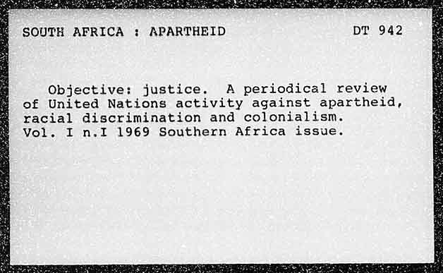 SOUTH AFRICA : APARTHEID DT 942 Objective: justice. A periodical review of United Nations activity against apartheid, racial discrimination and colonialism. Vol. I n.I 1969 Southern Africa issue.