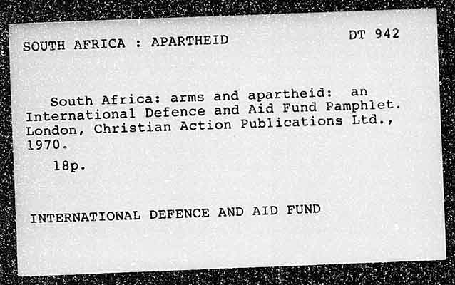 SOUTH AFRICA : APARTHEID South Africa: arms and apartheid: an International Defence and Aid Fund Pamphiet. London, Christian Action Publications Ltd.,; 1970. 18p. INTERNATIONAL DEFENCE AND AID FUND