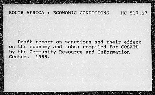 SOUTH AFRICA +: ECONOMIC CONDITIONS Draft report on sanctions and their effect on the economy and jobs; compiled for COSATU by the Community Resource and Information Center. 1988.