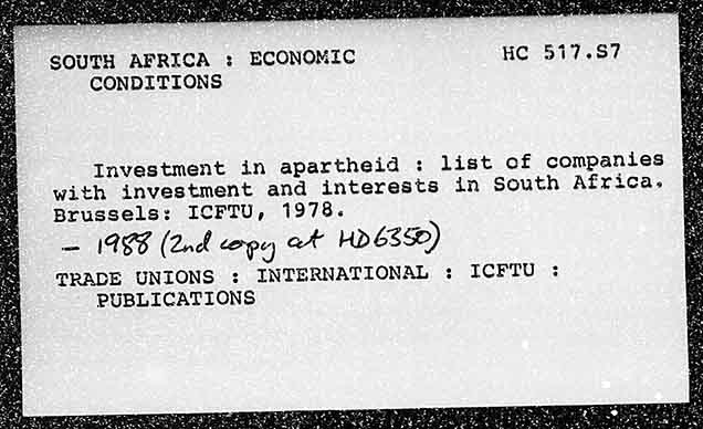 SOUTH AFRICA : ECONOMIC HC 517.87 CONDITIONS Investment in apartheid : list ef companies with investment and interests in South Africa. Brussels: ICFTU, 1978. — 1988 (2nd copy at HDES®) PRADE UNIONS : INTERNATIONAL : ICFTU : PUBLICATIONS