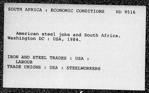 SOUTH AFRICA : ECONOMIC CONDITIONS HD 9516 American steel jobs and South Africa, Washington DC : USA, 1984. IRON AND STEEL TRADES : USA 3 LABOUR TRADE UNIONS : USA : STEELWORKERS
