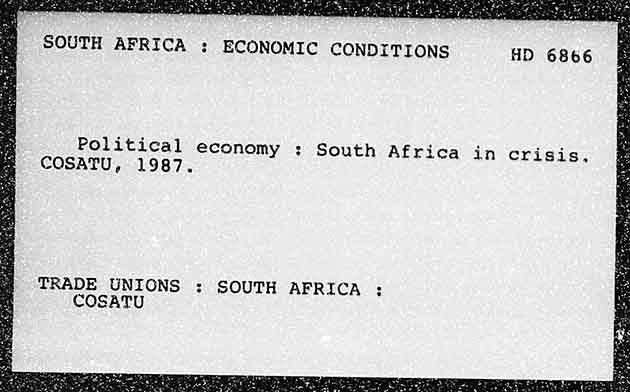 SOUTH AFRICA ; ECONOMIC CONDITIONS HD 6866 Political economy : South Africa in crisis, COSATU, 1987. TRADE UNIONS : SOUTH AFRICA : COSATU