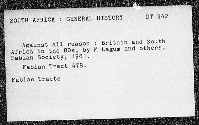 SOUTH AFRICA : GENERAL HISTORY DT 942 Against all reason : Britain and South Africa in the 80s, by M Legum and others. Fabian Society, 1981. Fabian Tract 478. Fabian Tracts