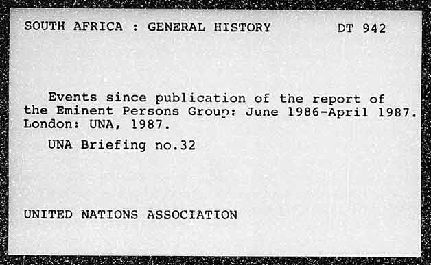 SOUTH AFRICA : GENERAL HISTORY Events since publication of the report of Hs the Eminent Persons Groun: June 1986-April 1987. London: UNA, 1987. ; UNA Briefing no.32 UNITED NATIONS ASSOCIATION