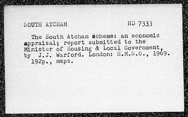 SOUTH ATCHAM BD27335 The South Atcham schemes an economic appraisals; report submitted to the Minister of Housing & Local Government by J.J. Warford. London: HoM.S.G6., 19 192p., maps. b9.