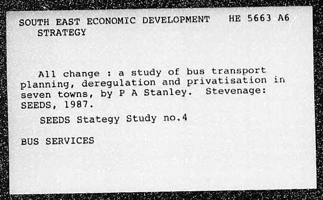 iia: Pa eran ak Ses SOUTH EAST ECONOMIC DEVELOPMENT HE 5663 A6 STRATEGY All change : a study of bus transport planning, deregulation and privatisation in seven towns, by P A Stanley. Stevenage: SEEDS, 1987. SREDS Stategy Study no.4 BUS SERVICES