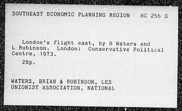 SOUTHEAST ECONOMIC PLANNING REGION HC 256 8 London's flight east, by B Waters and L Robinson. London: Conservative Political Centre, 1973. 2838p, WATERS, BRIAN & ROBINSON, LES UNIONIST ASSOCIATION, NATIONAL