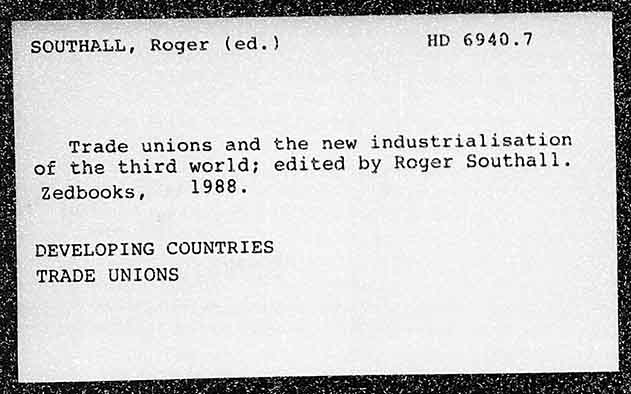 SOUTHALL, Roger (ed.} HD 6940.7 Trade unions and the new industrialisation of the third world; edited by Reger Southall. zZedbooks, 1988. DEVELOPING COUNTRIES TRADE UNIONS