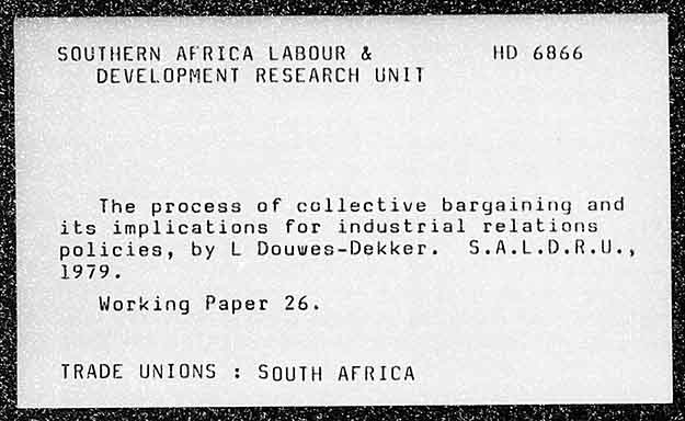 SOUTHERN AFRICA LABOUR & HD 6866 DEVELOPMENT RESEARCH UNIT The process of collective bargaining and its implications for industrial relations policies, by L Douwes-Dekker. 5S.A.L.D.R.U., 1979. Working Paper 26. TRADE UNIONS : SOUTH AFRICA