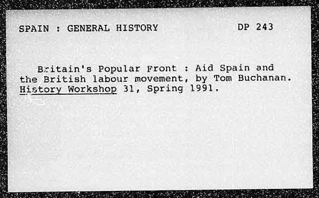 SPAIN : GENERAL HISTORY Britain's Popular Front : Aid Spain and the British labour movement, by Tom Buchanan. His story Workshop 31, Spring 1991.