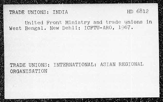 TRADE UNIONS: INDIA HD 6812 United Front Ministry and trade untons in West Bengal. New Dehli: ICFTU-ARO, 1967, TRADE UNIONS: INTERNATIONAL: ASIAN REGIONAL ORGANISATION