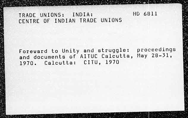 TRADE UNIONS: INDIA: HG 6811 CENTRE OF INDIAN TRADE UNIONS Foreward to Unity and struggle: proceedings and documents of AITUC Calcutta, May 28-31, Lori. Calcutta: GLIU, 1970
