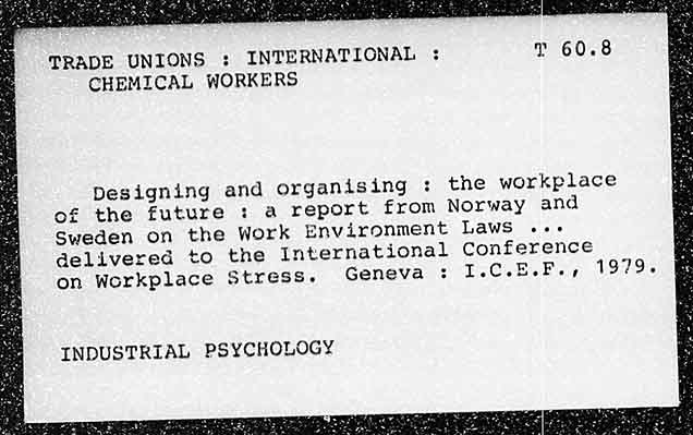 TRADE UNIONS : INTERNATIONAL : 7 60.8 CHEMICAL WORKERS Designing and organising : the workplace of the future : a report from Norway and Sweden on the Work Environment LawS ..«-. delivered to the International Conference on Workplace Stress. Geneva : Tes Cleibie Rial ya oe INDUSTRIAL PSYCHOLOGY