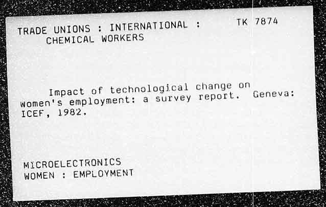 Peale eae TRADE UNIONS : INTERNATIONAL ; CHEMICAL WORKERS Impact of technological change on women's employment: a survey report, Geneva: ICEF, 1982. MICROELECTRONICS WOMEN : EMPLOYMENT