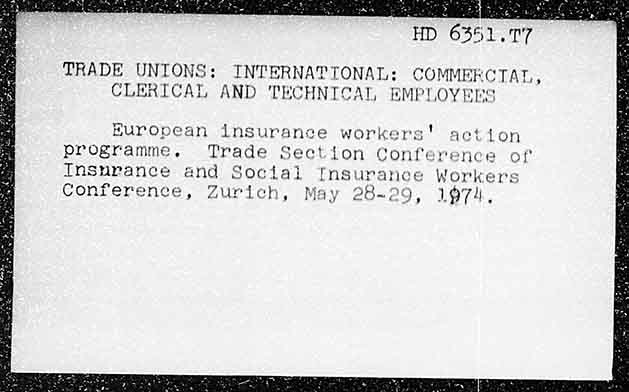HD 6351.77 _ TRADE UNIONS: INTERNATTONAL: COMMERCTAT, CLERICAL AND TECHNICAL, EMPLOYERS Huropean insuranze workers! action programme. Trade Section Conference of Insurance and Social Insurance Workers Conference, Zurich, May 28-209, 1974. A