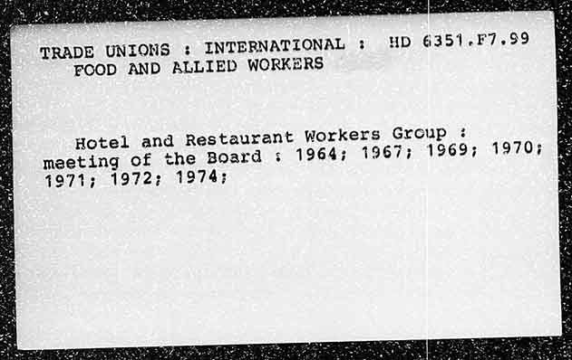 TRADE UNIONS : INTERNATIONAL ; HD 6351.F7.99 FOOD AND ALLIED WORKERS Hotel and Restaurant Workers Group : meeting of the Board ; 1964; 1967; 1969; 1970; 4971; 1972; 1974: