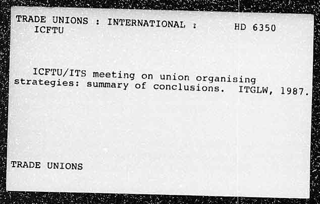 ree Mee roe ee s TRADE UNIONS : 3 HD 6350 : ICFTU ICFTU/ITS meeting on union strategies: Organising . Summary of conclusions. ITGLW, 1987.8 m TRADE UNIONS