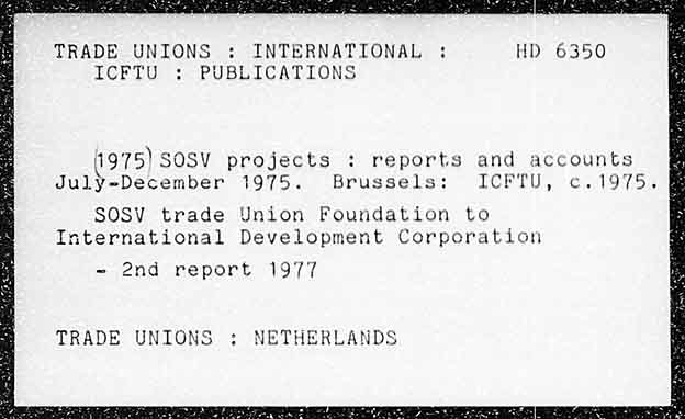 TRADE UNIONS : INTERNATIONAL : HD 6350 ICFTU :; PUBLICATIONS 1975) SOSV projects : reports and accounts Ee July-December 1975. Brussels: ICFTU, ¢c.1975. & SOSV trade Union Foundation to International Development Corporation - 2nd report 1977 TRADE UNIONS : NETHERLANDS