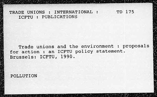 TRADE UNIONS : INTERNATIONAL ICFTU : PUBLICATIONS Trade unions and the environment : proposals for action : an ICFTU policy statement. Brussels: ICFTU, 1990. POLLUTION