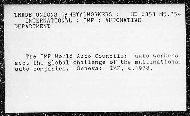 TRADE UNIONS :@#METALWORKERS ; HD 6351 INTERNATIONAL : IMF : AUTOMATIVE DEPARTMENT The IMF Worid Auto Councils: auto workers meet the global challenge of the muitinational auto companies. Geneva: IMF, c.1978.