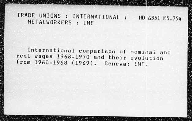 TRADE UNIONS : INTERNATIONAL : HD 6351 M5.754 METALWORKERS : IMF International comparison of nominal and real wages 1968-1970 and their evolution from 1960-1968 (1969). Geneva: IMF,