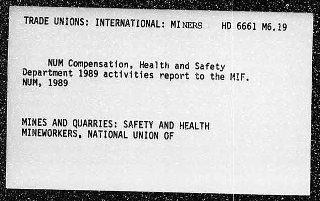 TRADE UNIONS: INTERNATIONAL: MINERS HD 6661 M6. 29 ; NUM Compensation, Health and Safety Department 1989 activities report to the MIF, NUM, 1989 MINES AND QUARRIES: SAFETY AND HEALTH MINEWORKERS, NATIONAL UNION OF