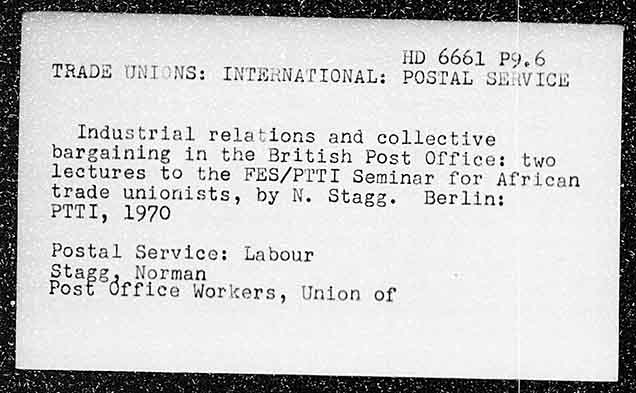 HD 6661 Po. 6 4 INTERNATIONAL: POSTAL SER Industrial relations and collective bargaining in the British Post Office: two lectures to the FES/PITI Seminar for African trade unionists, by N. Stagg. Berlin: PTTI, 1970 Postal Service: Labour SC ags Norman Post Office Workers, Union of